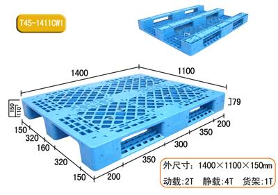 產(chǎn)品型號(hào): HD-1411cw1 產(chǎn)品貨號(hào): T45川字型塑料托盤 產(chǎn)品外尺寸: 1400×1100×150mm 產(chǎn)品內(nèi)尺寸: 產(chǎn)品結(jié)構(gòu): 單面網(wǎng)格川字底型 產(chǎn)品內(nèi)容量(L): 承重量(T): 動(dòng)載2T,靜載4T,貨架載1T 產(chǎn)品認(rèn)可標(biāo)準(zhǔn): ISO9001:2000質(zhì)量體系認(rèn)證
