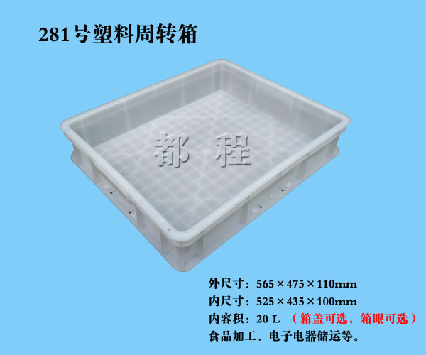 編號: 281 外尺寸(mm): 565*475*110 內(nèi)尺寸(mm): 525*435*100 內(nèi)容積(L): 20 備注: 食品加工、電子電器儲運等(箱蓋、箱眼可選)。